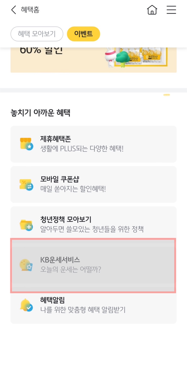 2. 혜택 홈에서 이벤트를 클릭하고 하단의 놓치기 아까운 혜택 부분에 있는 KB 운세서비스를 클릭합니다.
