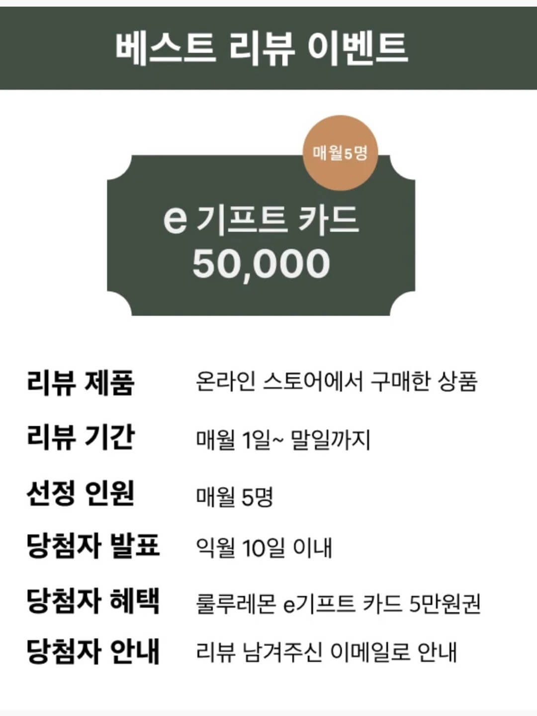 룰루레몬은 타 스포츠 웨어 홈페이지보다 상품평이 적은 편인데요. 그렇기 때문에 리뷰가 하나하나 소중합니다. 저도 지난 9월에 사진을 함께 올린 리뷰를 간단하게 썼는데 베스트 리뷰 이벤트에 당첨되어 5만 원짜리 기프트 카드를 받았는데요.