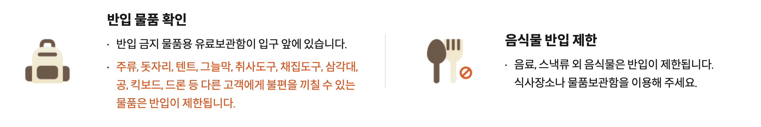 타인에게 불편을 줄 수 있는 주류, 돗자리 취사도구, 채집도구, 킥보드 드론 등은 반입이 불가능합니다. 음식물도 음료와 스낵 류 외에는 반입이 제한되니, 물품 보관함(유료, 이용료 1천 원)을 이용하시기 바랍니다.