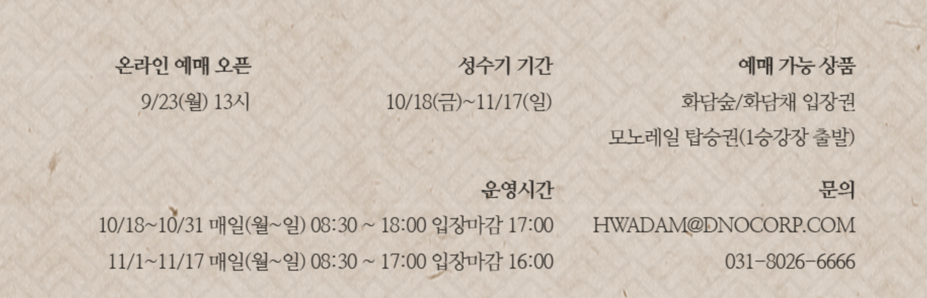 예매기간 동안 화담숲/화담채 입장권 예매가 가능하며, 모노레일 탑승권도 함께 예매가 가능합니다.