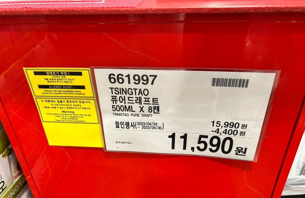 최근에 GS편의점에서 칭따오 퓨어 드래프트 4캔에 6,000원 행사가 있었습니다. 언제 편의점 들러서 사오나 하는 생각 때문에 구매를 망설이고 있었는데, 오늘 코스트코에 가니 마침 세일 중이네요. 8캔에 11,590원. 심지어 편의점 행사보다 저렴합니다. 이러면 안살 수 없겠죠?