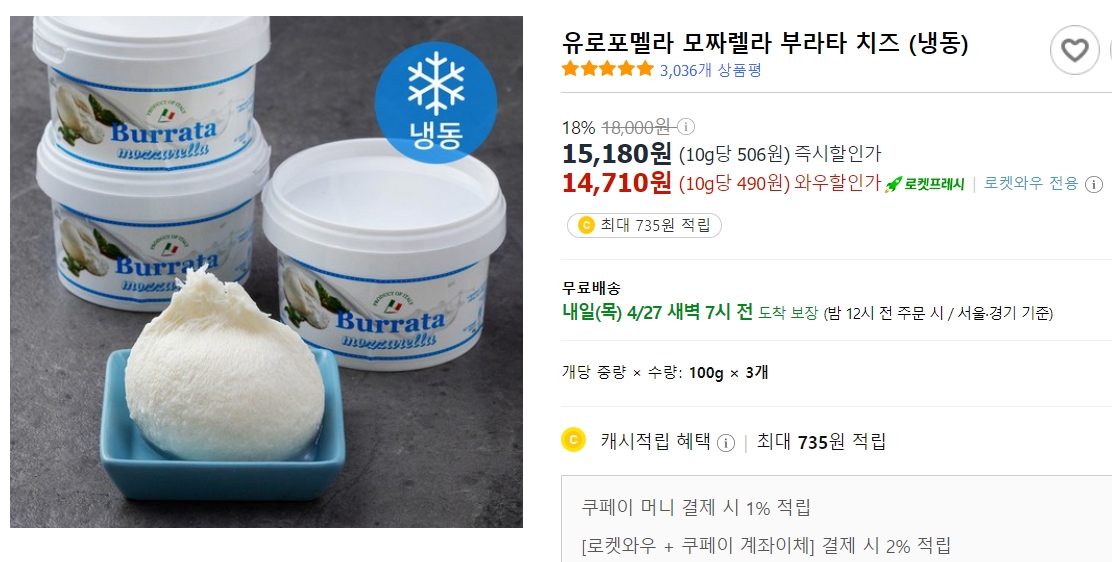 쿠팡에서 종종 사먹던 브라타 치즈입니다. 발사믹 소스와 곁들여서 먹으면 보들보들하니 풍미가 좋은 치즈인데, 오늘 코스트코에 가니 세일중입니다. 쿠팡에서는 3개에 14,710원에 팔고 있습니다. 개당 가격은 4900원 정도.