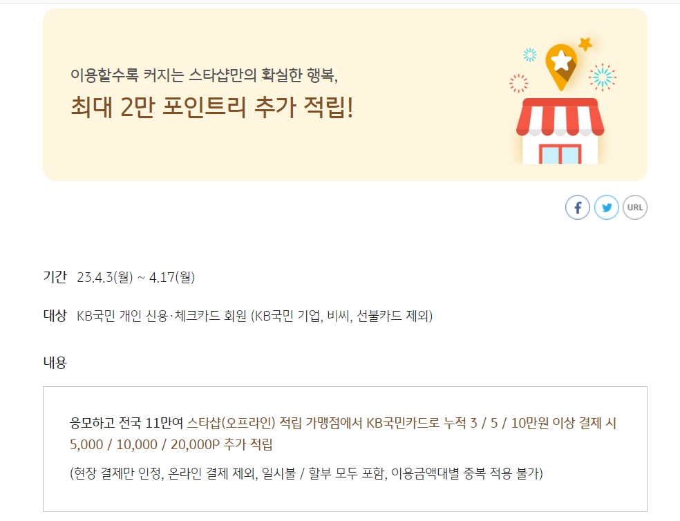 지난달에 이어 오프라인 스타샵 캐시백 적립 이벤트가 4월에도 돌아왔습니다. 스타샵에서 현명하게 이용하시고 캐시백으로 돌려받으세요! 기간이 4월 전체기간이 아닌 4월 17일까지 임을 주의하시기 바랍니다. KB카드 내 이벤트란에서 응모 후, 중간중간 이용금액확인도 가능합니다.