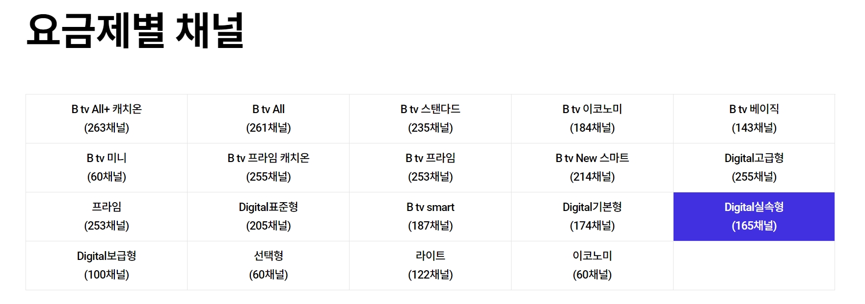 | 종합편성채널 | [15번] JTBC [16번] MBN [18번] 채널A. [20번] TV CHOSUN |