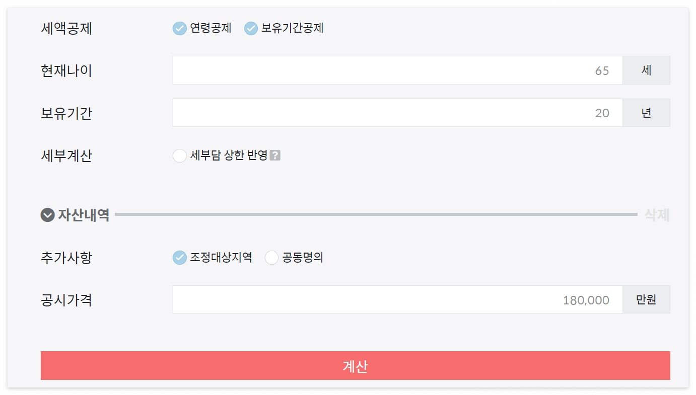 현재나이 65세, 보유기간 20년, 그리고 공시가격 18억으로 입력하여 조회해 보겠습니다.