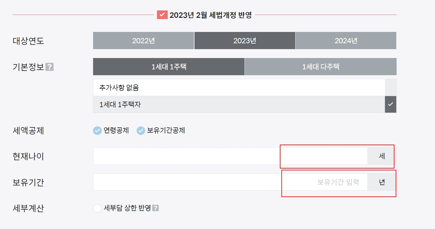 1세대 1주택 여부 확인해서 넣어주시고, 공시지가에서 조회된 금액을 넣어줍니다. 공동명의인 경우에도 따로 표시해서 계산을 눌러주면 됩니다.