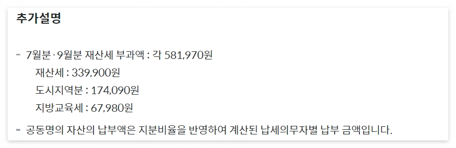 재산세는 7월과 9월 두 번에 걸쳐서 부과되는 세금입니다. 이처럼 7월과 9월 각각의 세금 부과액이 조회되어 쉽게 확인해 볼 수 있습니다.