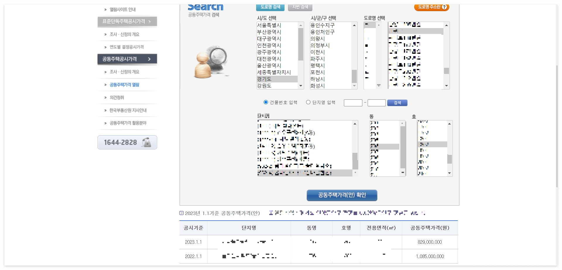 시/도 선택 → 시/군/구 선택 →도로명 선택 →건물번호 또는 단지명을 선택하고 동 호수를 넣어주면, 작년과 올해의 공시가격이 조회됩니다.